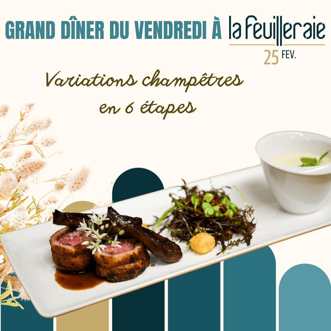 RDV le 18 mars pour un nouveau Grand Dîner à La Feuilleraie, autour d'un menu dégustation mettant à l'honneur les producteurs et artisans locaux avec lesquels le chef Guillaume Lamory travaille : Endive au Brie de Meaux et girolles pickles - Croquette de coulommiers aux noix - Roulade d’aubergine au chèvre frais d’ici et jambon Speck…