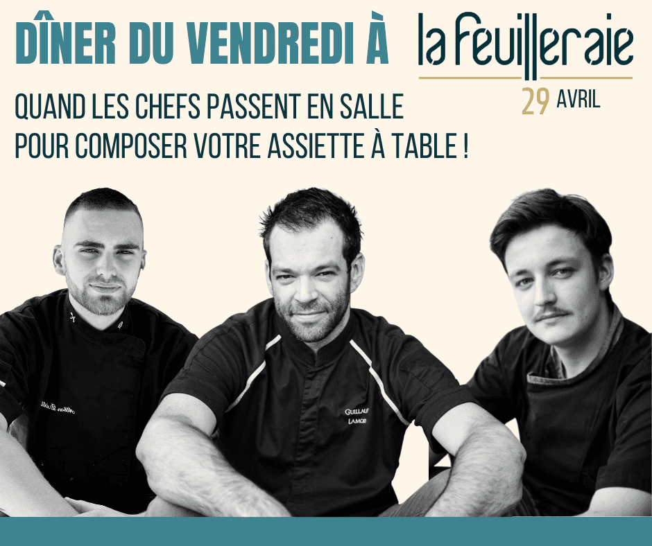 RDV le vendredi 29 avril, pour un nouveau Dîner à La Feuilleraie : nos chefs passeront en salle pour réaliser à votre table, sous vos yeux, 2 des plats du menu : un carpaccio terre ou mer, et des asperges à décliner en fonction de vos envies ! Le menu en détail : Toast de…