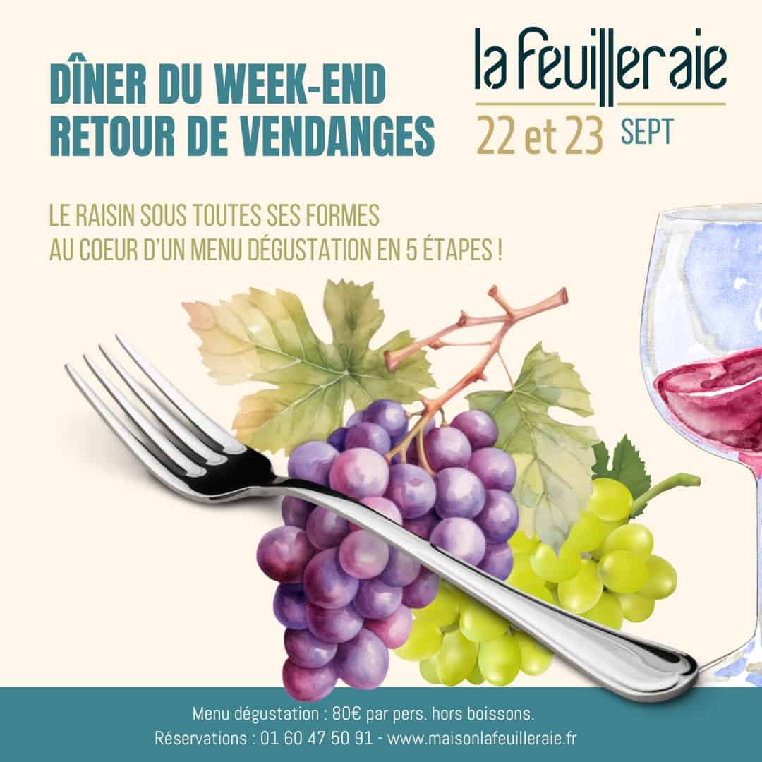 Pour ce nouveau dîner spécial « Retour de vendanges », le chef Guillaume Lamory vous proposera d’apprécier le fruit des vignes de l’entrée au dessert ! Oeuf parfait aux girolles et à la moutarde de Brives, volaille au vin jaune, poisson de ligne et sa sauce miroir de vin rouge aux légumes glacés, pain perdu au moult de raisin et sorbet muscat, sabayon au champagne…