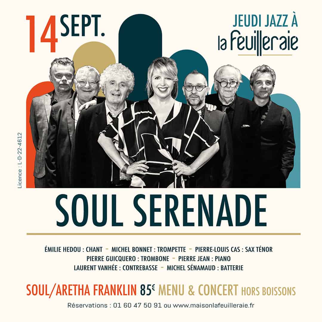 SOIRÉE COMPLÈTE !!! SOUL SERENADE, c'est 6 musiciens venant du swing New Orleans et du jazz, et une chanteuse issue du gospel et de la soul music des années 60. Ensemble, ils reprennent le répertoire d'Aretha Franklin, Otis Redding et Ray Charles en adaptant chaque titre à leur façon ! Emilie se balade dans son univers avec…